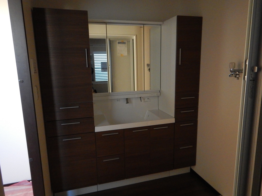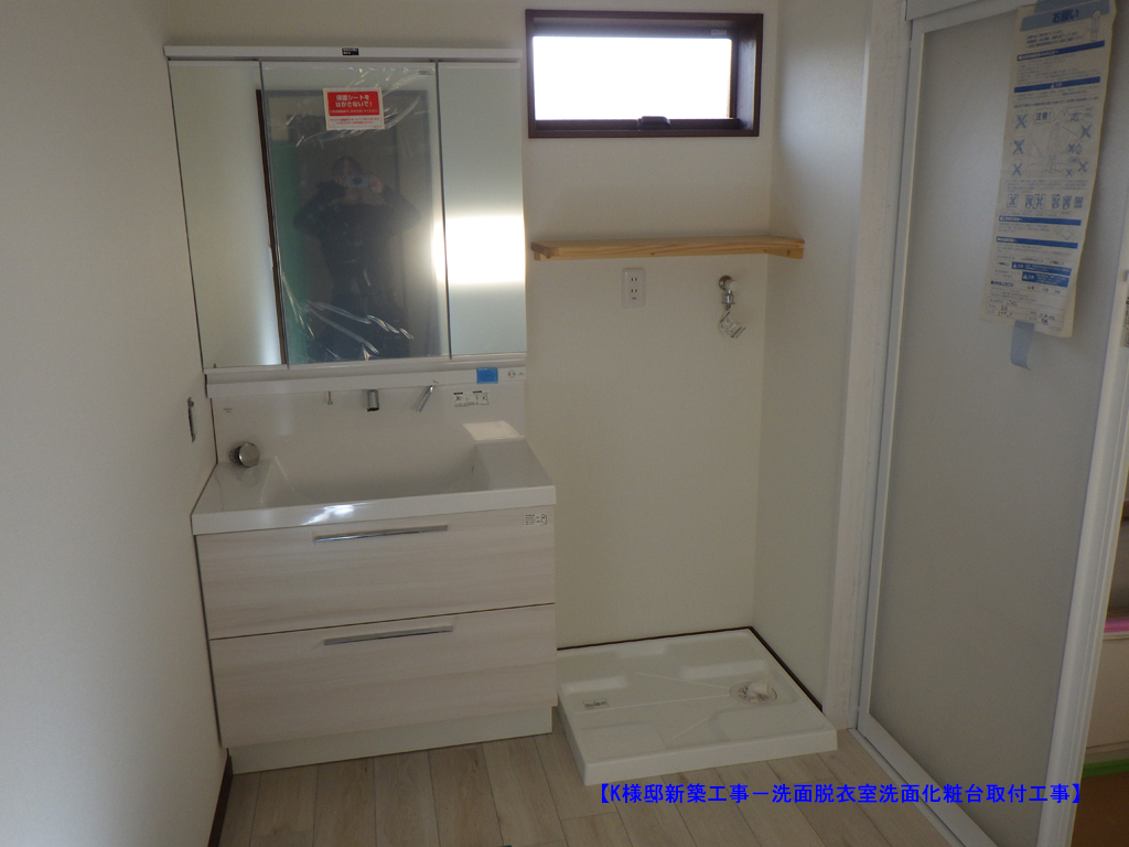 洗面化粧台と洗濯機置き用の洗濯機パン及び全自動洗濯機用水栓を取り付けた状況です。