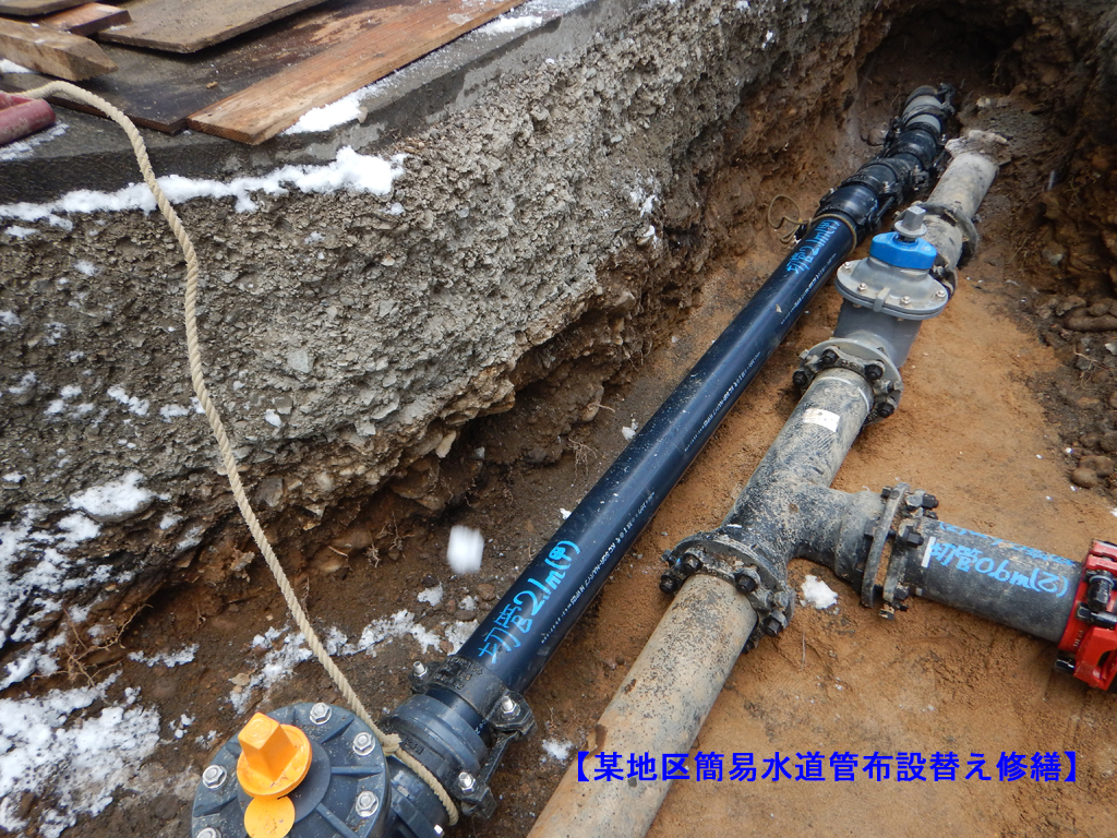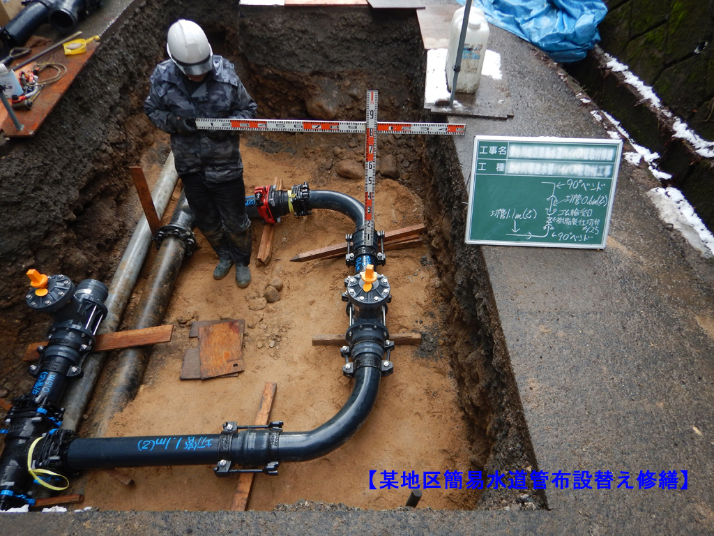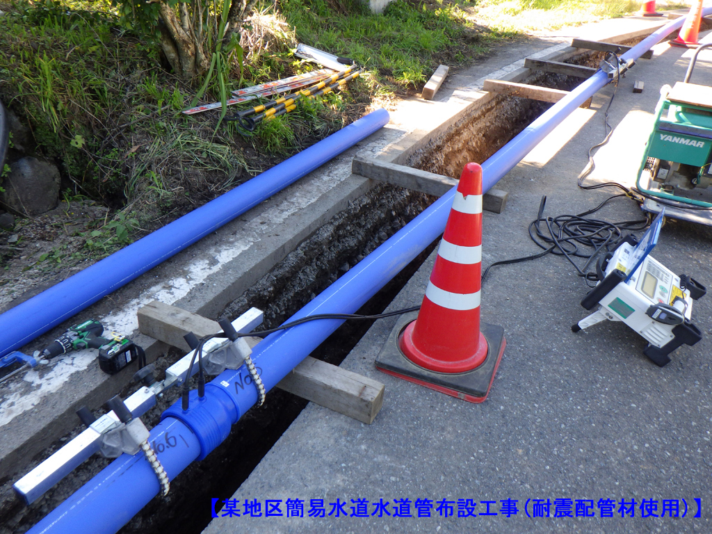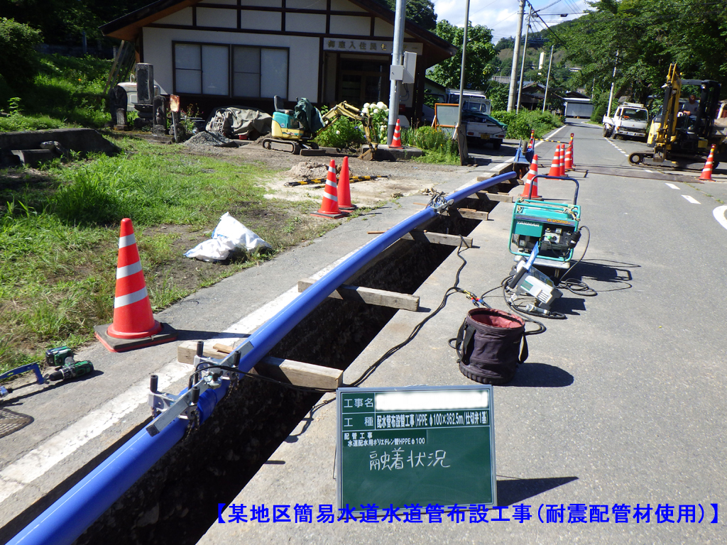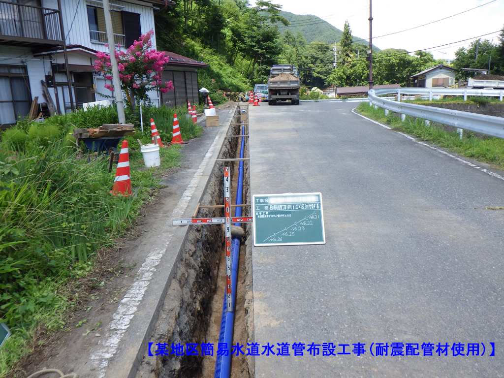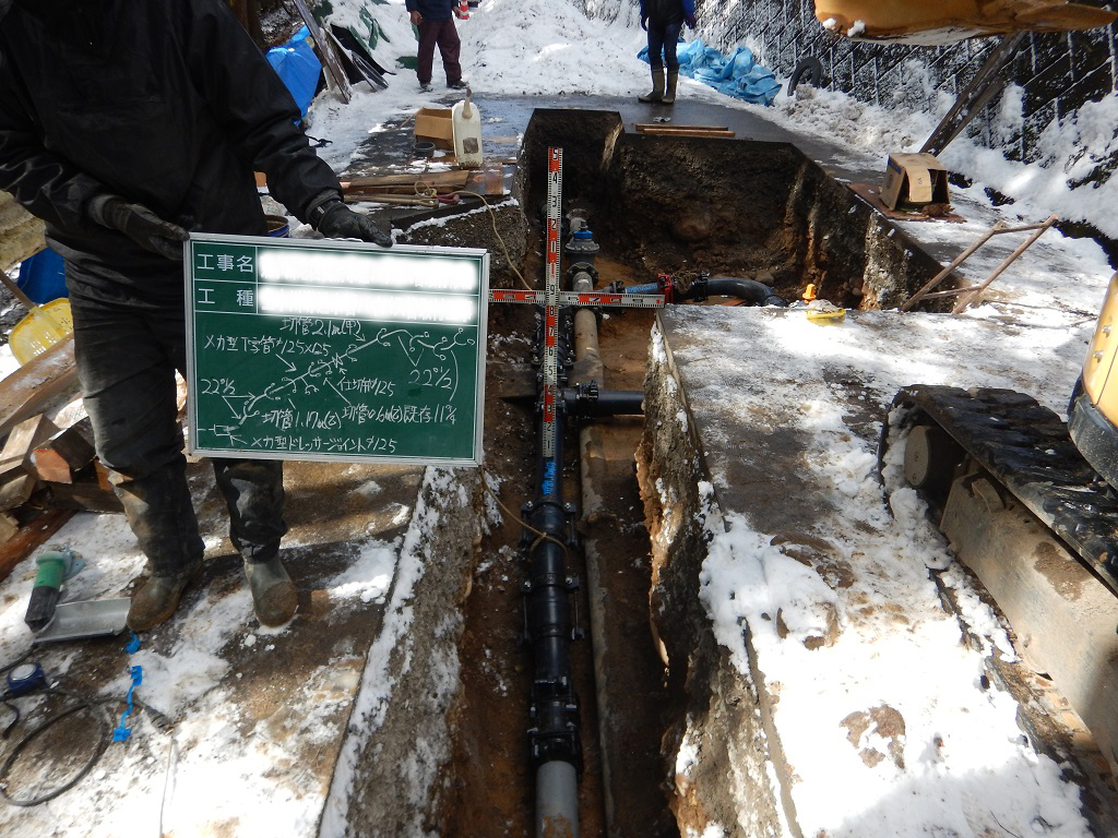 片品村の簡易水道配管工事の模様です。耐震配管材を指定され水道排水用ポリエチレンパイプを配管してます。