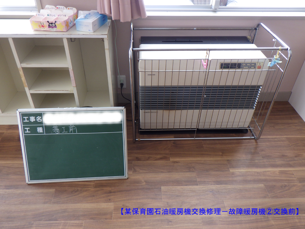 地元保育園の故障したFF式石油暖房機を交換する前の様子です。