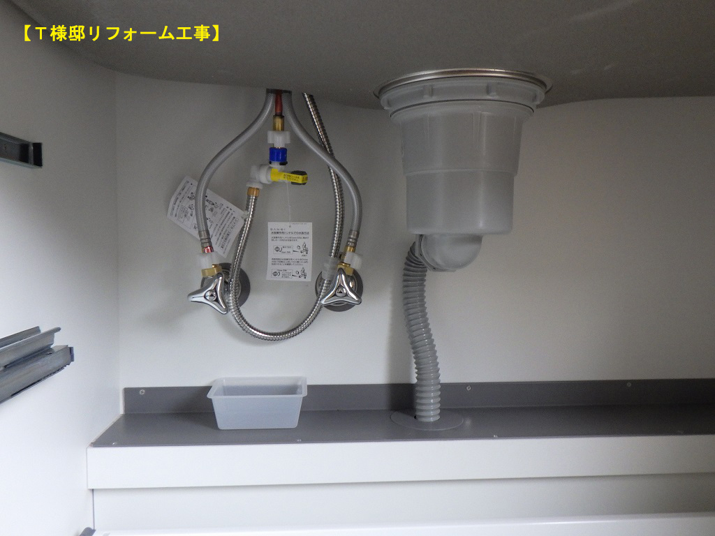 キッチン器具組み立て作業-キッチン棚内部給排水給湯管を接続しています。