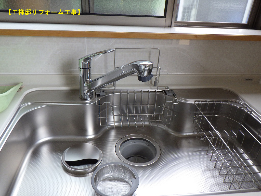 キッチン器具組み立て作業-水栓器具を取り付けた状況です。